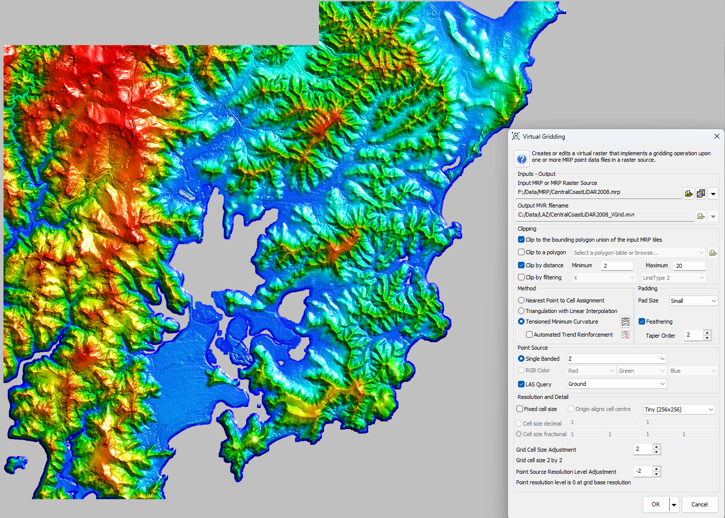 ProRaster can grid point clouds in real-time using a virtual gridding operation. This remarkable capability allows you to grid and render trillion-point datasets in real-time, at any scale. Interactively modify your gridding method parameters to control the gridding operation. Select from Nearest Neighbour, Delauney Triangulation, or Tensioned Minimum Curvature gridding methods.